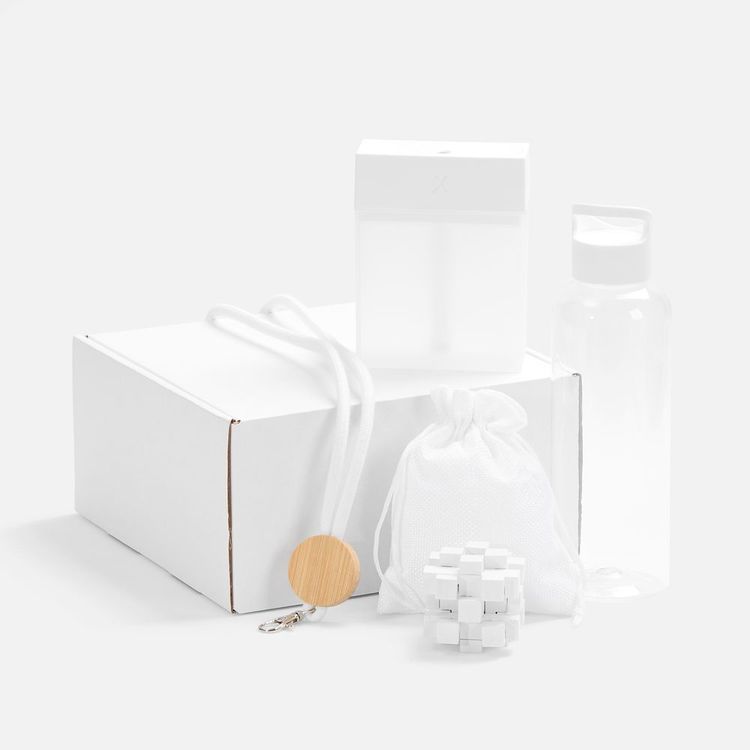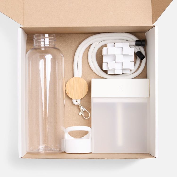 Набор собран с заботой: помимо надёжного шнурка для бейджа — для быстрой идентификации на новом месте — здесь есть полезные аксессуары для гидратации как внешней, так и внутренней: компактный увлажнитель воздуха и стильная бутылка для воды. А дополняет эти функциональные предметы игра-головоломка, которая поможет и развить пространственное мышление, и переключить внимание — а в первые рабочие дни разгружать голову просто необходим/