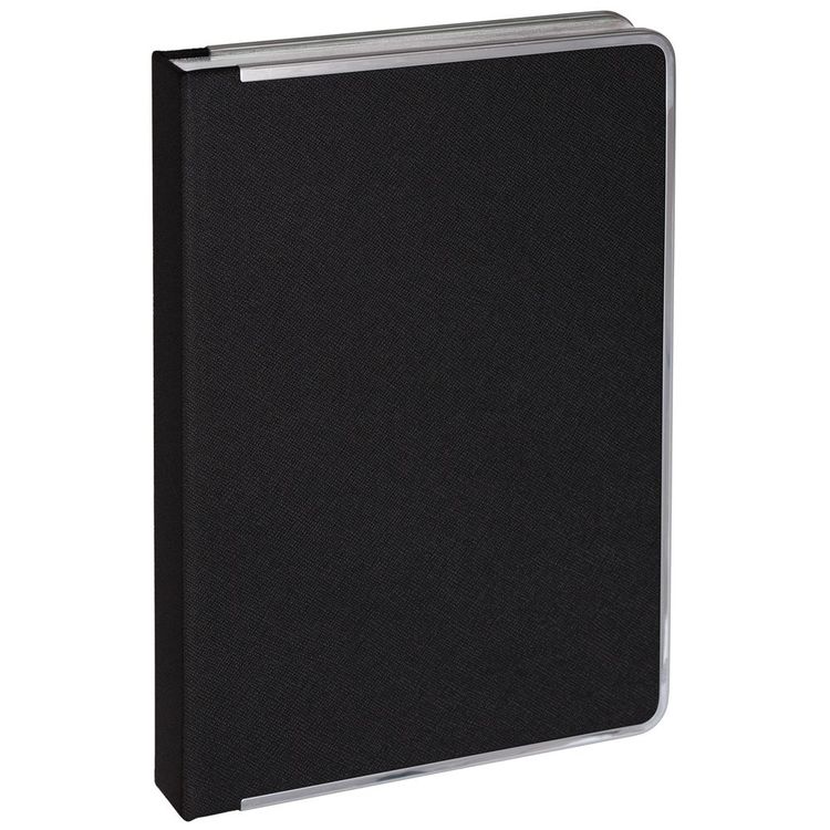 Ежедневник с твердой обложкой и серебристым обрезом, выполнен из материала Saffian, черный, дополнен серым ляссе и металлическими рамками.