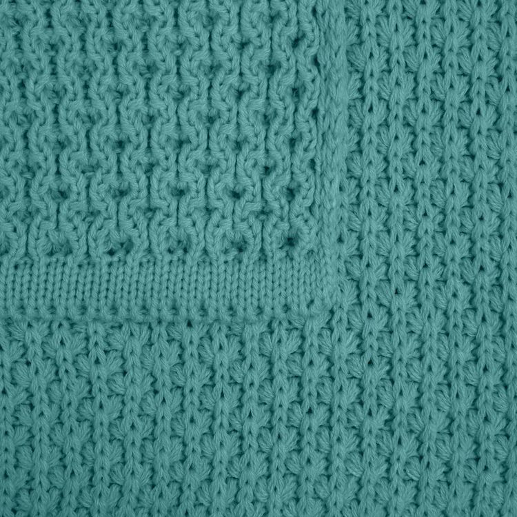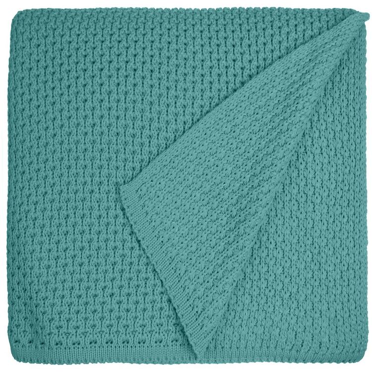 Модель: однотонный плед с фактурной вязкой, которая позволяет сделать его воздушным и объемным. Чередуя различные типы петель на гладком полотне, можно вывязать любую графику — логотип, текст, товарный знак.