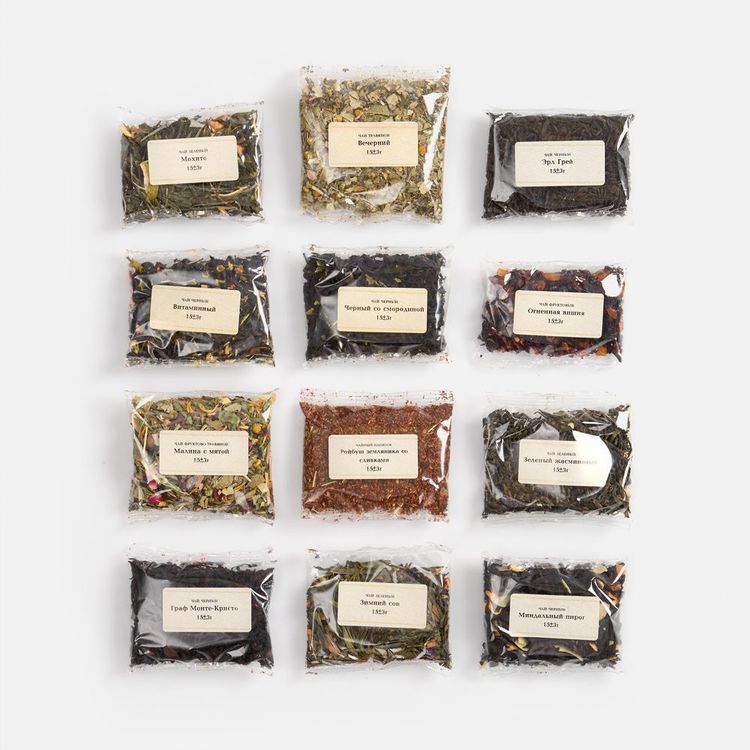 В наборе 12 видов чая:- Миндальный пирог. Состав: черный чай среднелистовой, лепестки миндаля, кусочки яблок, корица дробленая, цветки апельсинового дерева, ароматизатор «Миндаль».