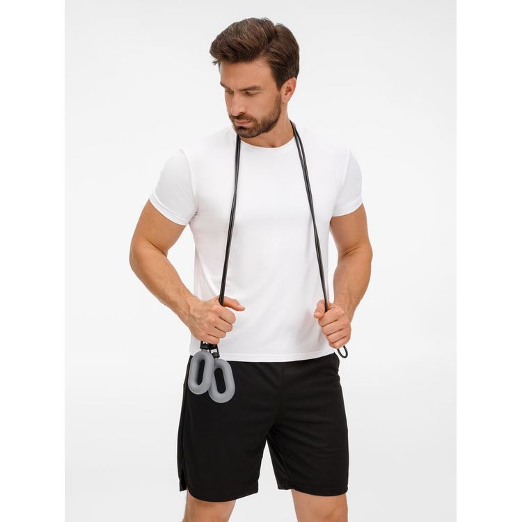 Шнур к ручкам-эспандерам крепится через пластиковый переходник с отверстиями для продевания шнура. Эспандеры выполнены из тактильно приятного силикона, обладающего высокой степенью эластичности и прочности, а широкий шнур (5 мм) из плотного ВПХ.