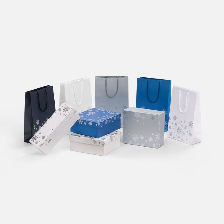 - Пакет из бумаги плотностью 120 г/м²с покрытием софт-тач и тиснением серебристой фольгой.Выдерживает вес до 2 кг.