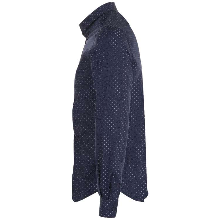 - Модная рубашка с печатным рисунком в горошек, которая прекрасно впишется в современный корпоративный стиль.Облегающая модель с маленьким классическим воротничком, планкой с 7 пуговицами тон в тон и манжетами на 1 пуговице с разрезом «капуцин».