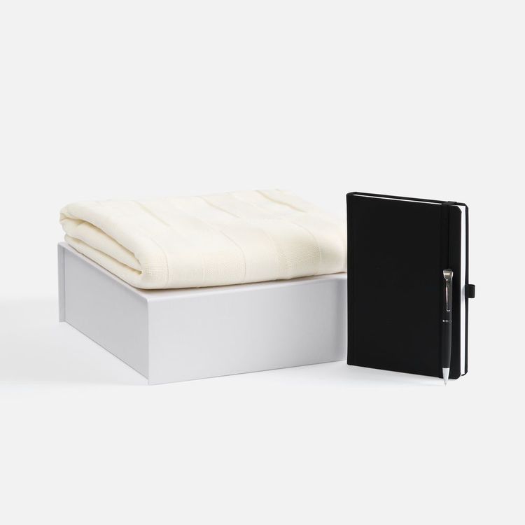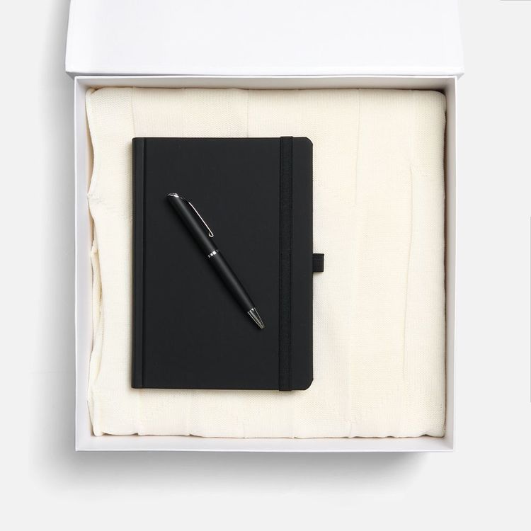 - Однотонный набор с основной канцелярией и пледом — классика жанра в уютном исполнении. С компактным ежедневинком будет удобно делать заметки в любое время — благодаря петельке для ручки любимый пишущий инструмент будет всегда под рукой. А изысканный акриловый плед с геометрическим узором позволит выразить самые теплые пожелания и ддобавит плавных линий в интерьер.