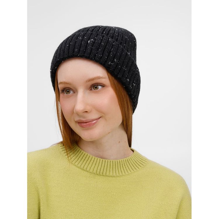 - Шапка-бини с отворотом выполнена крупной резинкой из мягкой акриловой пряжи, которая создает дополнительный объем и хорошо сохраняет тепло. Благодаря оригинальному дизайну она позволит создать запоминающийся образ со стильным и лаконичным акцентом.