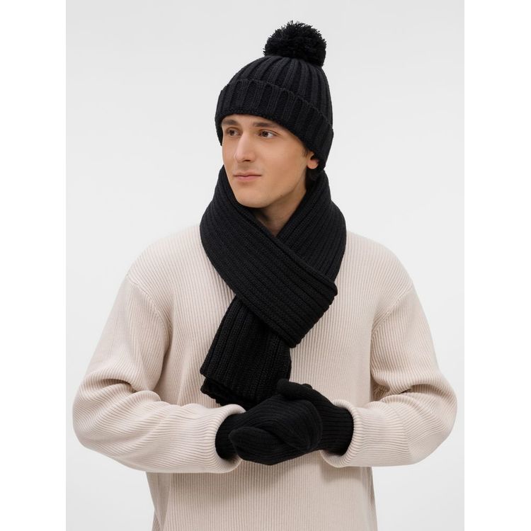 Шапка с пышным помпоном и отворотом, связанная крупной резинкой создает игривый силуэт, а широкий шарф с выразительной текстурой надежно защищает от ветра, сохраняя свободу движений. Варежки с отворотом-резинкой плотно облегают запястье, не пропуская холод.
