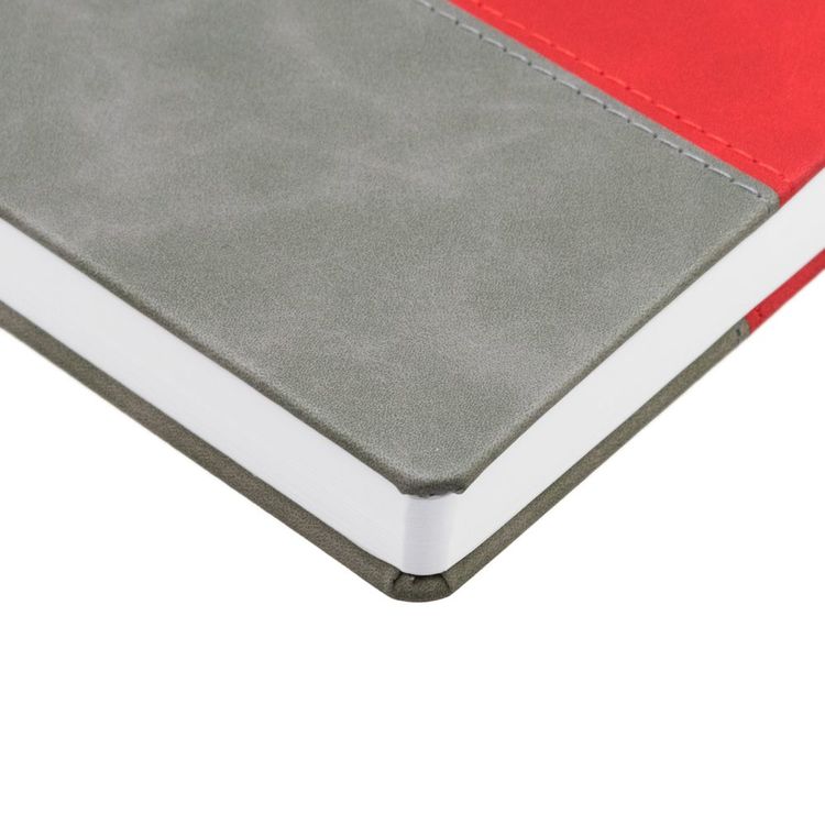 Ежедневник с твердой обложкой, без поролона, со сшивкой материалов Nubuck Touch, серый СС, и Nubuck Touch красный РР, дополнен двойным ляссе и петлей-резинкой для ручки.