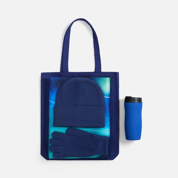 - Набор «Ваше сиятельство» — это выражение заботы и нетривиальный комплимент в одном шопере! В нем тонко переплетены дух современного города и очарование северной сказки. Его элементы лаконичны и функциональны, а главная изюминка — живописный плед с изображением северного сияния — добавляет ноту настоящего чуда.
