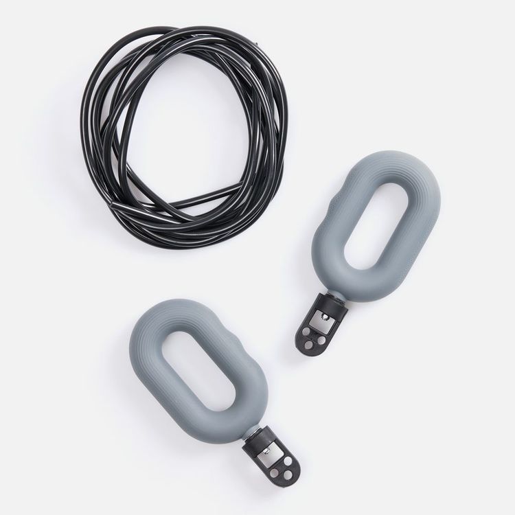 Шнур к ручкам-эспандерам крепится через пластиковый переходник с отверстиями для продевания шнура. Эспандеры выполнены из тактильно приятного силикона, обладающего высокой степенью эластичности и прочности, а широкий шнур (5 мм) из плотного ВПХ.