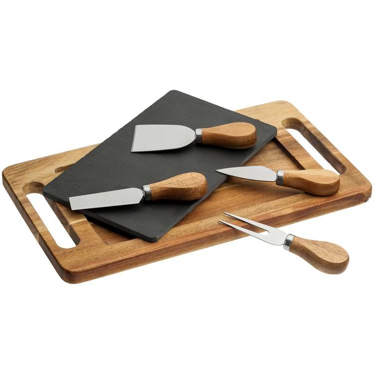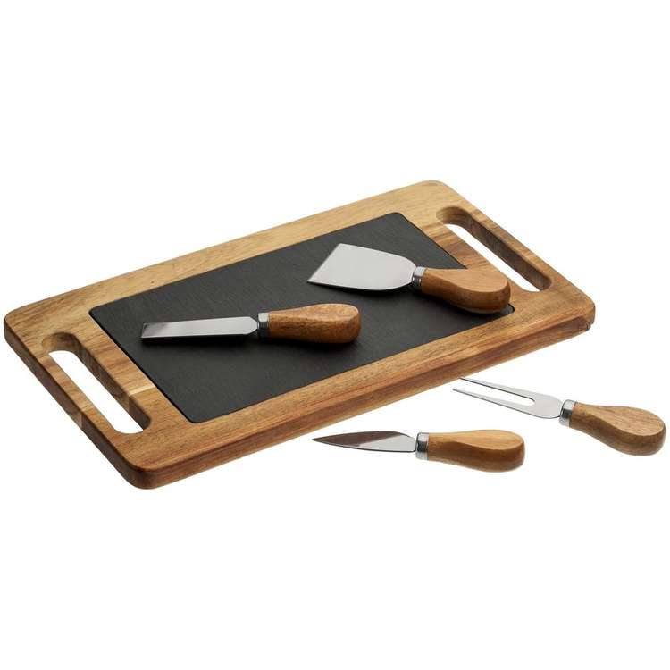 - В наборе 6 предметов:разделочная доска из сланца;деревянный поднос для сервировки;вилка для сыра;нож-лопатка для мягкого сыра;нож-топорик для твердых сыров;листовидный нож для сыра твердых сортов.Сланец — экологически чистый камень, который совершенно безопасен при контакте с пищей, отличается износостойкостью и не впитывает влагу. Поднос и рукоятки ножей выполнены из дерева акации, лезвия — из высококачественной нержавеющей стали.Поставляется в белой транспортной коробке.