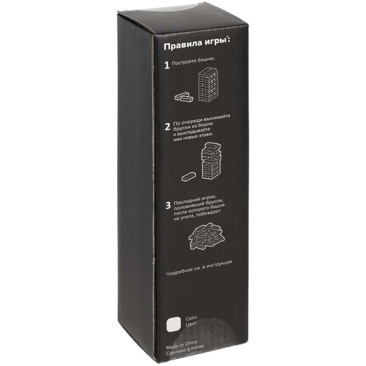 - Второе название игры — «Падающая башня». Сначала строится башня: по три брусочка в ряд, каждый слой перпендикулярен предыдущему. Затем игроки по очереди вытаскивают по одному брусочку и кладут его на верх сооружения. Тот игрок, кто обрушит башню, проиграл. Игра тренирует ловкость, внимание, терпение и пространственное мышление, что очень важно и в бизнесе. Так что подарок не только развлечет, но и может стать символом-пожеланием.Игра состоит из 48 деревянных брусочков. Поставляется в картонной коробке.