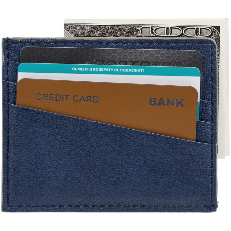 - Чехол выполнен из материала Petrus, синий НН, дополнен окрашенным срезом края и внутренним карманом из серого картона. Имеет 4 отделения для кредитных карт и 1 отделение для купюр.