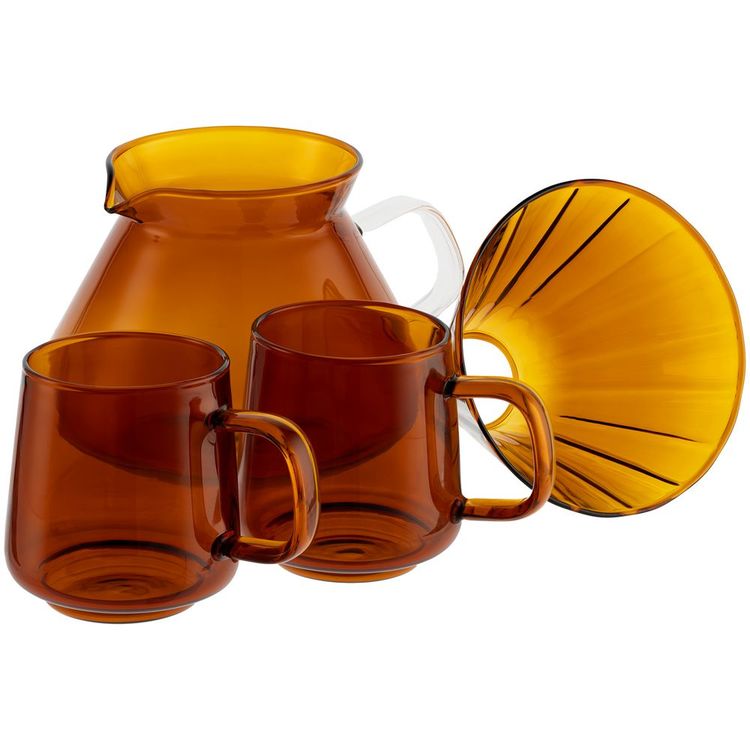 - Крепкий ароматный кофе — настоящий источник силы, а приготовление кофе методом «пуровер» — отдельный приятный ритуал, вполне претендующий на звание кофейной церемонии.Процесс напоминает приготовление в кемексе, но все же немного отличается, поэтому и вкус напитка получается другим. Этот метод заваривания помогает раскрывать цветочные, ягодные и фруктовые ароматы.Элегантный кофейный набор Force Nexus добавит эстетики кофе-брейку и порадует ценителей своим изысканным современным исполнением. Благодаря тонкому боросиликатному стеклу кружки, воронка и кофейник Force Nexus очень легкие, а янтарный цвет привлекает внимание и добавляет теплоты.Как приготовить кофе методом пуровер:Выберите кофе среднего помола. На 1 чашку потребуется 15 граммов кофе на 250 мл воды. При любом объеме напитка ориентируйтесь на эту пропорцию.Вскипятите воду и остудите ее в течение минуты до достижения температуры 93-95º С. При возможности используйте градусник или датчик.Подготовьте бумажный фильтр для воронки. Сначала рекомендуем пролить через него 100-200 мл горячей воды, а затем вылить ее. Засыпьте кофе в фильтр, а для его равномерного распределения аккуратно встряхните воронку.Cлегка смочите кофе небольшим количеством воды (из расчета 3 к 1 по отношению к количеству всего кофе). Затем начните аккуратно вливать воду по часовой стрелке от центра.Можно вливать воду единовременным или интервальным методами: последний поможет усилить экстракцию кофе, но займет чуть больше времени. Общее время заваривания составит от 2,5 до 4 минут.Извлеките и выбросьте фильтр, а для лучшего насыщения напитка кислородом слегка взболтайте кофейник. Наслаждайтесь неповторимым вкусом!Емкость чашки 210 мл.Емкость кофейника 750 мл.Поставляется в индивидуальной упаковке.