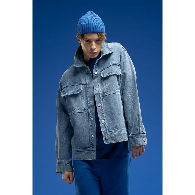 Джинсовая куртка унисекс на кнопках свободной посадки.- Два нагрудных кармана с клапанами