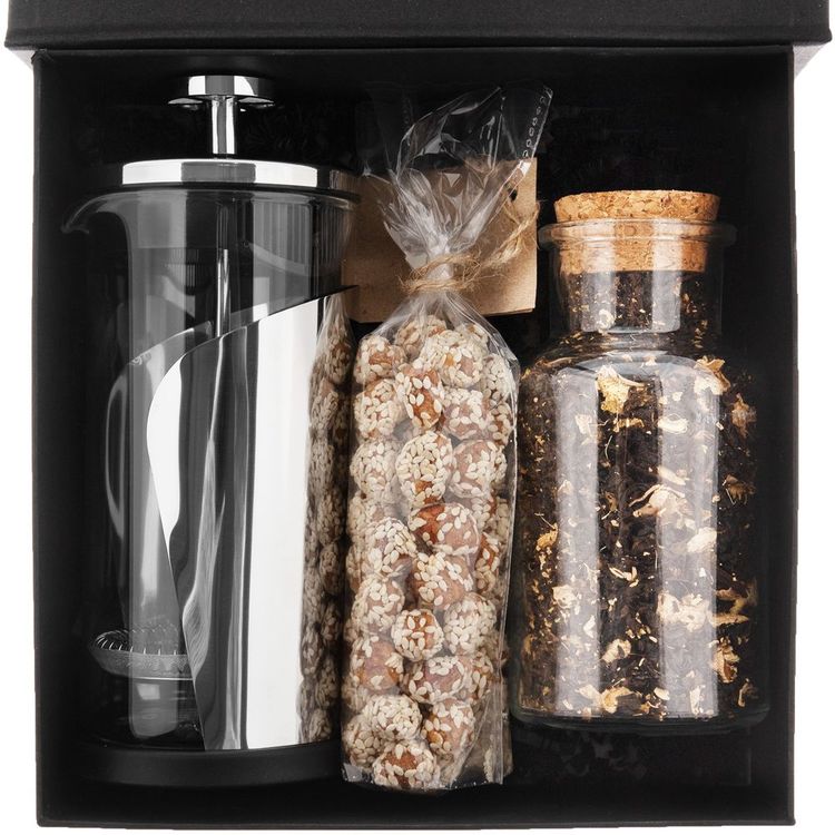 - Набор Teacode — прекрасный подарок ценителям чая и всем неравнодушным к хрустящим снекам. Сладкий арахис в кунжуте, ароматный, пропитанный соком имбиря чай и френч-пресс для заваривания в стильной упаковке гарантированно обеспечат заряд энергии и хорошего настроения.