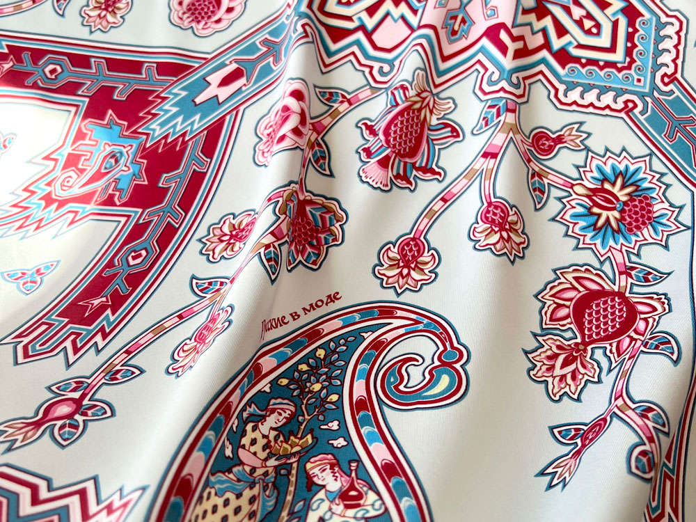 - Дизайн платка Кавказский скакун от бренда Русские в моде by Nina Ruchkina навеян прекрасным и загадочным Востоком, вдохновляющим творцов всего мира. В центре принта аксессуара изображена гордая лошадь - один из главных символов величественного Кавказа, ассоциирующийся с дивной красотой, силой, смелостью и огнём. Изящный скакун окружён бутой - языками пламени, роскошными цветами плодородного граната, изящно простирающимися меж колоритного орнамента знаменитых восточных ковров. В каждом элементе буты можно увидеть национальные промыслы и традиционные музыкальные инструменты — лютню (удд), бубны, почитаемые народами дивного Востока. Этот платок идеально подойдет амбициозным, целеустремленным и уверенным в себе девушкам, стремящимся сделать каждый свой образ неповторимым! Дизайн: Нина Ручкина, Наталия Александрова.