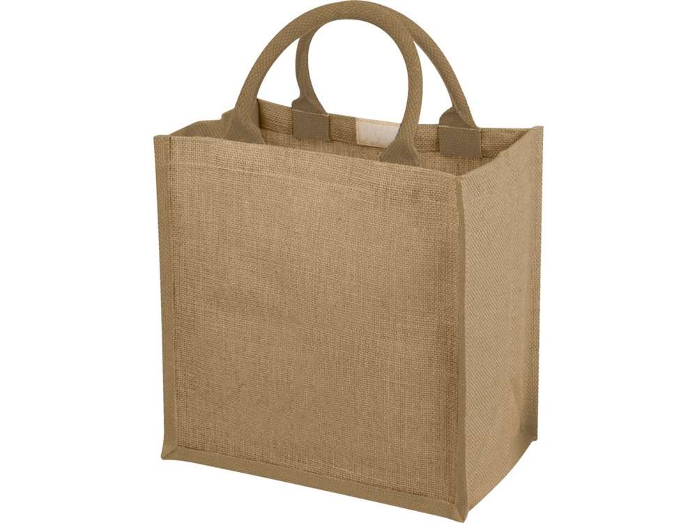 - Джутовая подарочная сумка Chennai. Джутовая сумка с ламинированным открытым основным отделением и вставкой. Хлопковые ручки высотой 11,5 см. Джут.