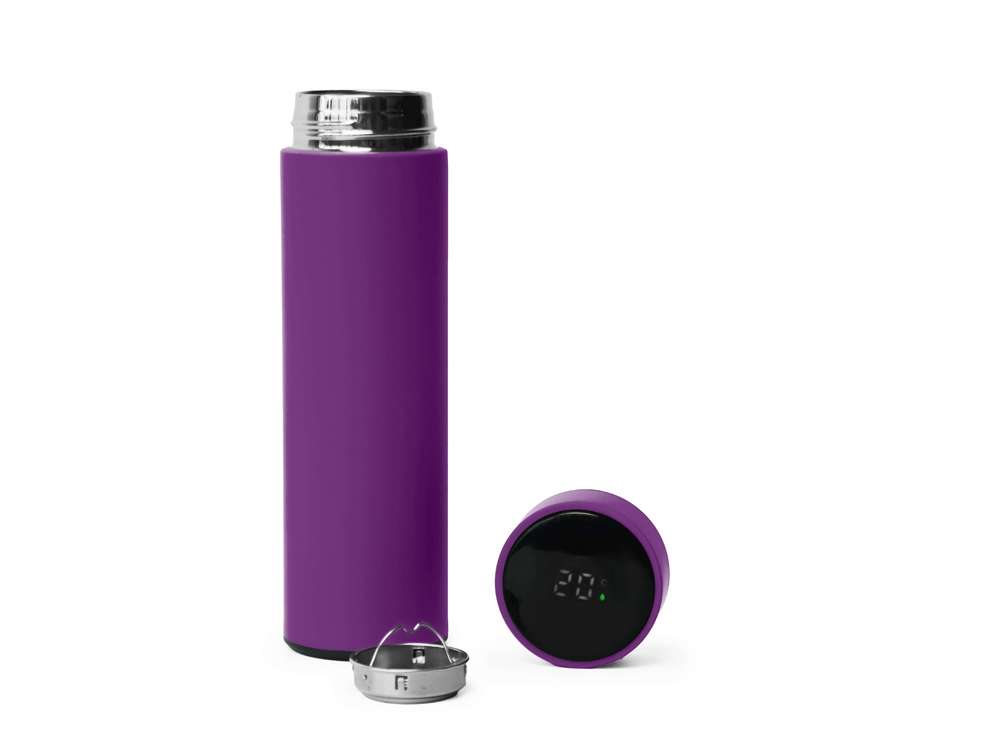 - Термос из нержавеющей стали, покрытый цветным soft touch, с крышкой, в которой встроен термометр и LED дисплей, показывающий температуру внутри термоса. Объем: 500 мл. Упаковка: каждый термос в крафт коробке.