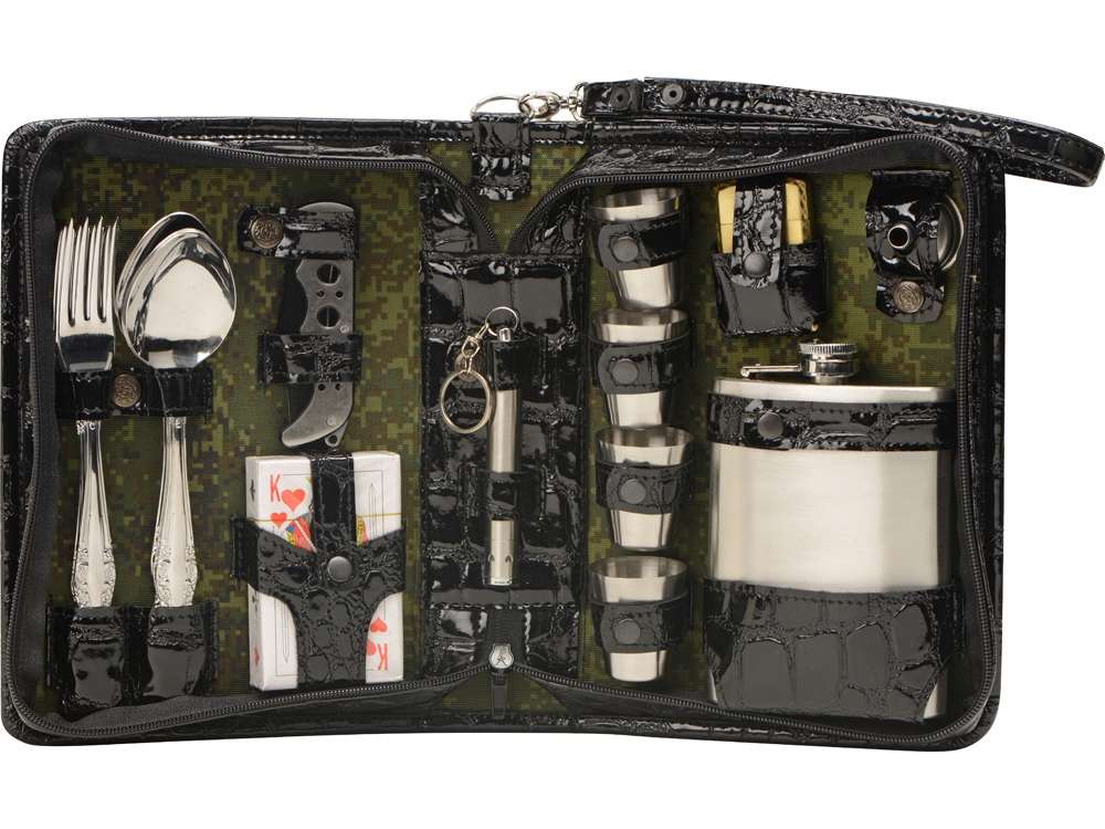 - Оригинальный дорожный набор на 4 персоны в барсетке с удобным ремешком для переноски. В набор входит: - фляжка 240 мл- 1 шт - стопка 30 мл- 4 шт - ложка столовая- 4 шт - вилка столовая- 4 шт - воронка- 1 шт - нож- 1шт - зажигалка- 1шт - фонарик- 1 шт (батарейка AAA в комплекте) - карты игральные- 1 шт Трафаретная печать (1 цвет (цветные изделия)) на данный товар осуществляется бесплатно. Оплачивается только настройка оборудования в размере 8200 рублей на весь тираж.
